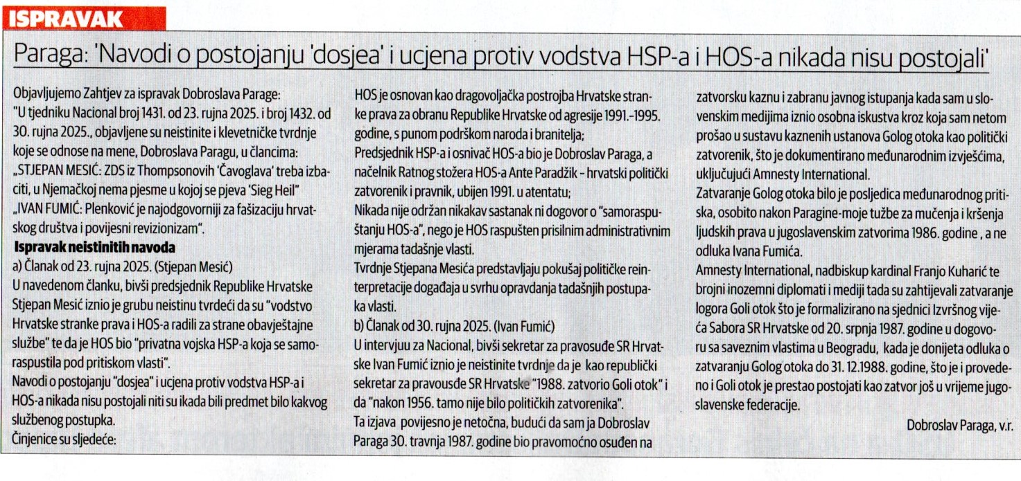 13. studeni 2025 TJEDNIK NACIONAL: ISPRAVLJA GRUBE KLEVETE I PODMETANJA STIPE MESIĆA I IVANA FUMIĆA MESIĆ IZMISLIO SASTANAK VRHOVNIŠTVA STRANKE PRAVA SA TUĐMANOVIM ŠEFOM POLICIJE JOSIPOM BOLJKOVCEM DOK BATINAŠ FUMIĆ SEBI PRIPISUJE ZASLUGE ZATVARANJA GOLOG OTOKA