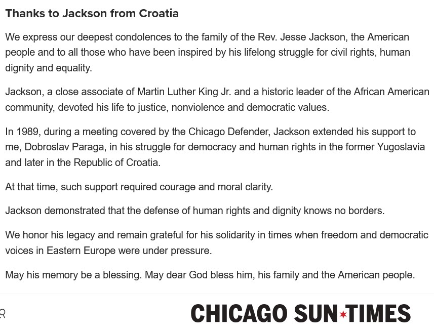 14. ožujak 2026. "CHICAGO SUN TIMES": ZAHVALA VELEČASNOM JESSE JACKSONU IZ HRVATSKE